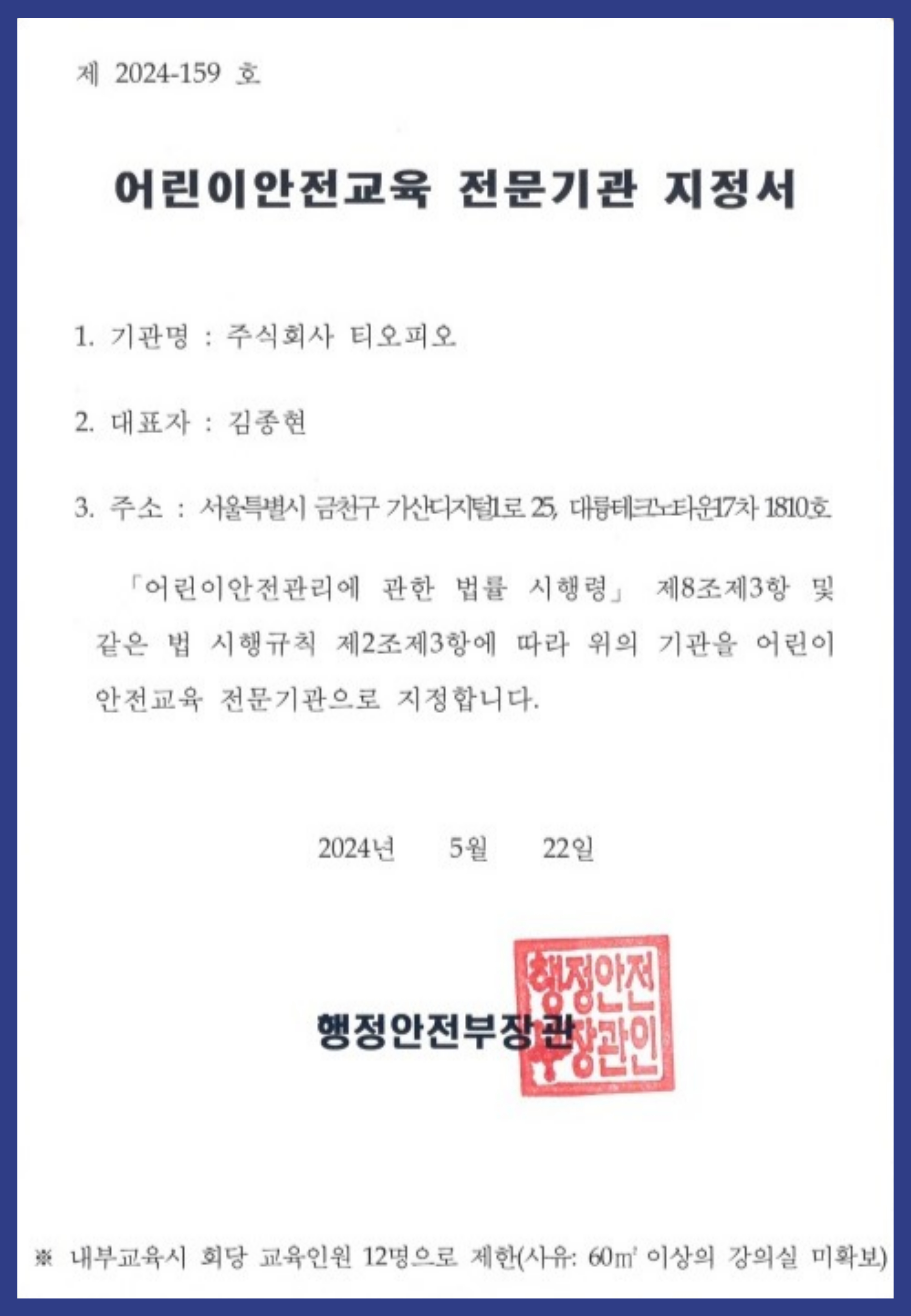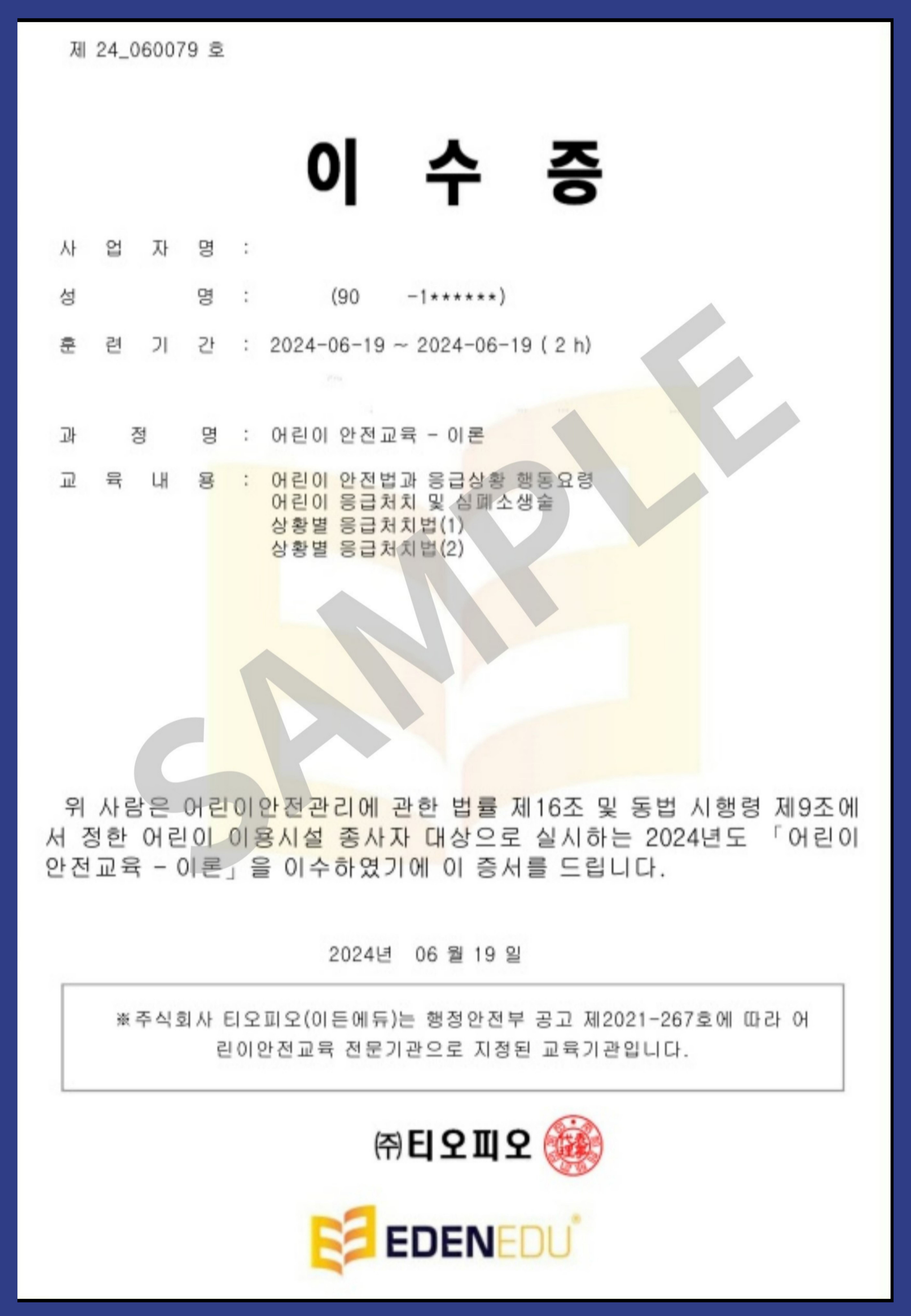 [어린이안전관리에 관한 법률] 제 16조 1항 어린이이용시설 관리주체는 종사자에게 응급처치 실습 등을 포함한 어린이안전교육을 실시 하여야 한다. 이 경우 대통령령(행정안전부 지정 인증기관: 주식회사 티오피오(이든에듀)) 으로 정하는 바에 따른 어린이안전교육 전문기관에 위탁할 수 있다.
