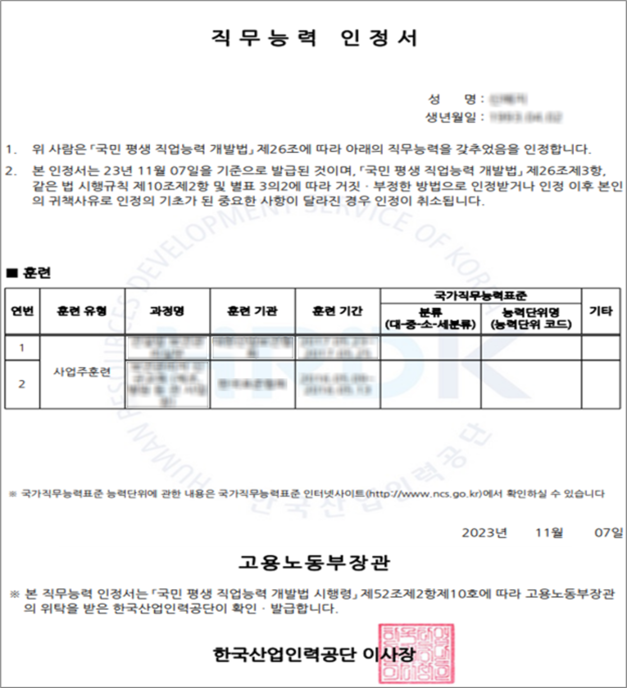 | 보유하고 있는 직무능력 인정내역 확인 |